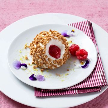 Cream gelato with a heart of strawberry and raspberry sauce all rolled in a buttery cookie crumble